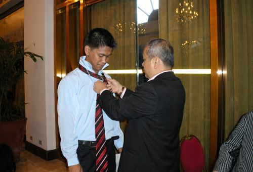 The picture that represents how much we care for our students. Our CEO, Tony Fudolig, helps a new chemist with his tie for the oathtaking.